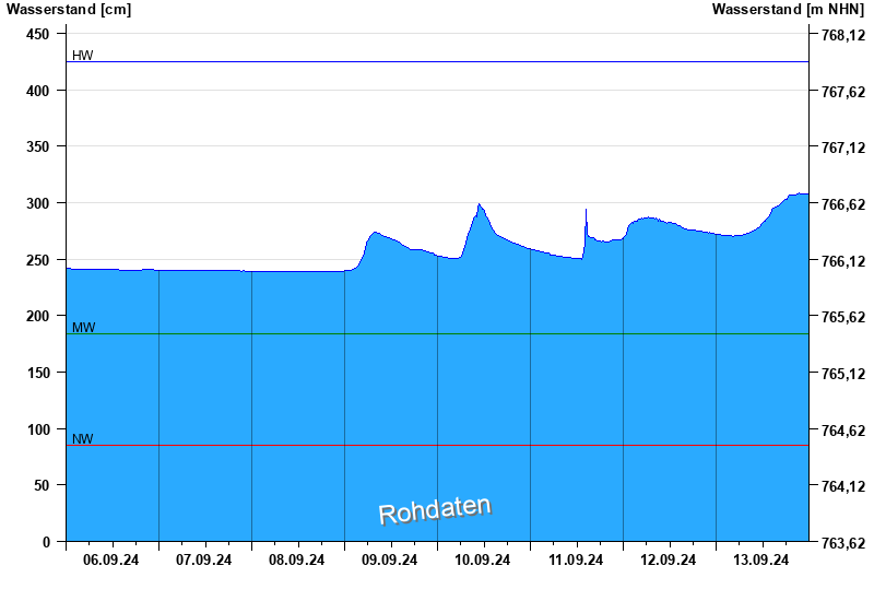 Störung wegen Stromversorgungsprobleme. Der Wasserstand wird durch starke Kiesumlagerungen beeinflusst. Der hier gezeigte Abfluss kann entsprechend stark vom tatsächlichen Abfluss abweichen.
