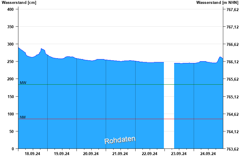 Störung wegen Stromversorgungsprobleme. Der Wasserstand wird durch starke Kiesumlagerungen beeinflusst. Der hier gezeigte Abfluss kann entsprechend stark vom tatsächlichen Abfluss abweichen.