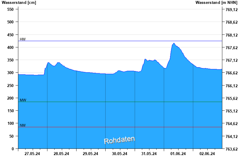 Störung wegen Stromversorgungsprobleme. Der Wasserstand wird durch starke Kiesumlagerungen beeinflusst. Der hier gezeigte Abfluss kann entsprechend stark vom tatsächlichen Abfluss abweichen.