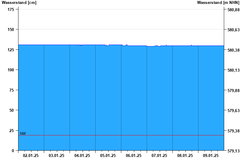 Der Pegel wird durch Baumaßnahmen unterhalb beeinflusst (Rückstau). Entsprechend sind die Abflusswerte nicht korrekt