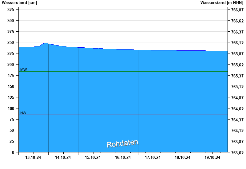 Störung wegen Stromversorgungsprobleme. Der Wasserstand wird durch starke Kiesumlagerungen beeinflusst. Der hier gezeigte Abfluss kann entsprechend stark vom tatsächlichen Abfluss abweichen.