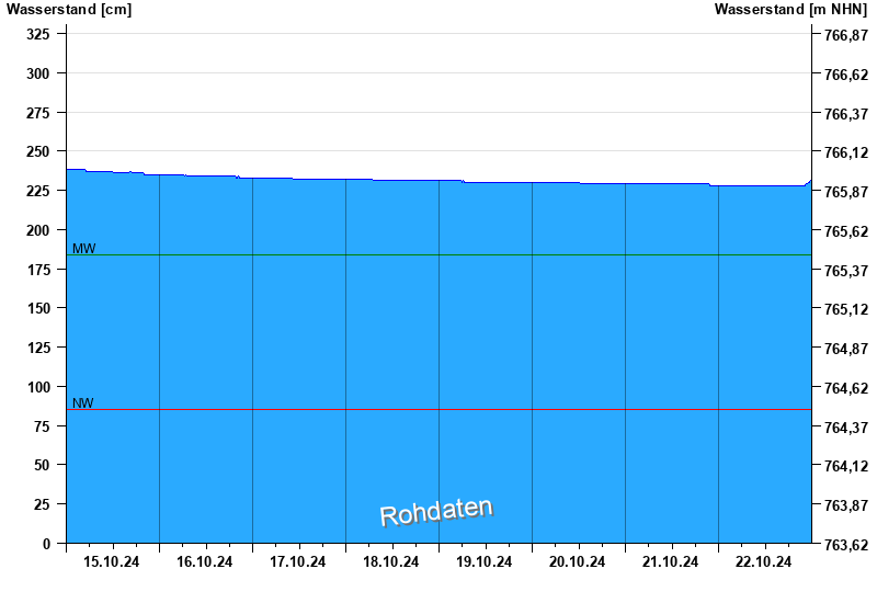 Störung wegen Stromversorgungsprobleme. Der Wasserstand wird durch starke Kiesumlagerungen beeinflusst. Der hier gezeigte Abfluss kann entsprechend stark vom tatsächlichen Abfluss abweichen.