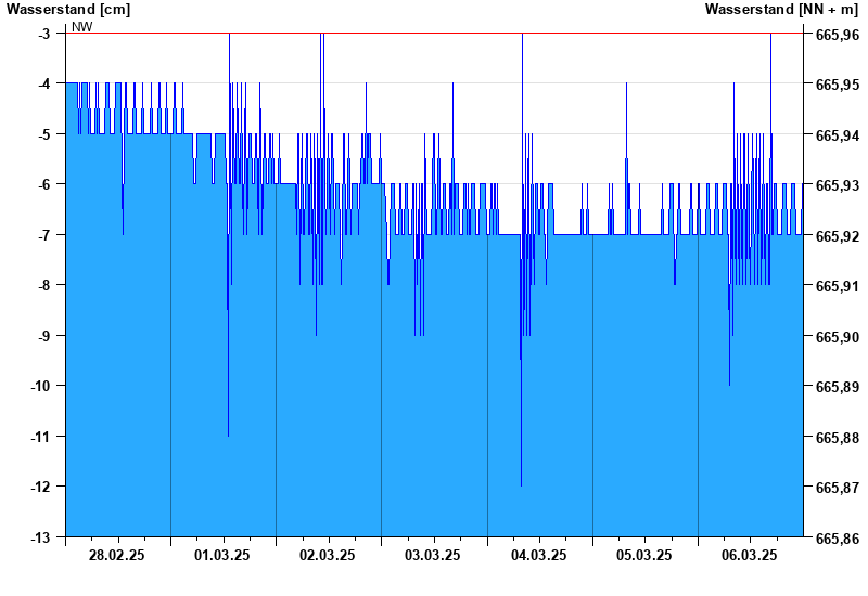 Messwerte beeinflusst durch Kraftwerkssteuerung und Kiesumlagerungen. Kiesanlandungen können bei Niedrigwasser Trockenlegung der Messinstrumente bewirken.