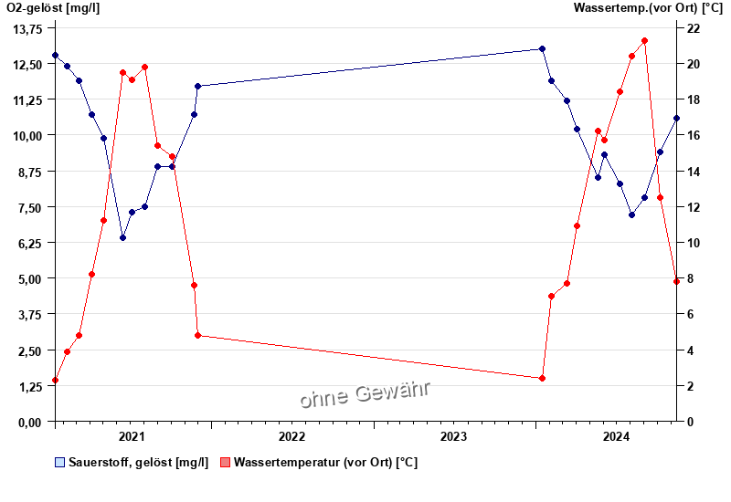 | Datum | O2-gelöst [mg/l] | Wassertemp.(vor Ort) [°C] |