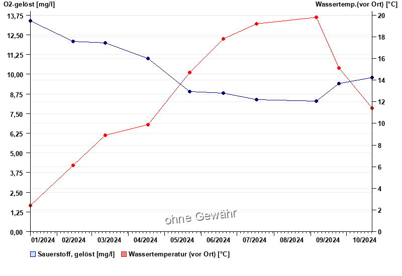 | Datum | O2-gelöst [mg/l] | Wassertemp.(vor Ort) [°C] |