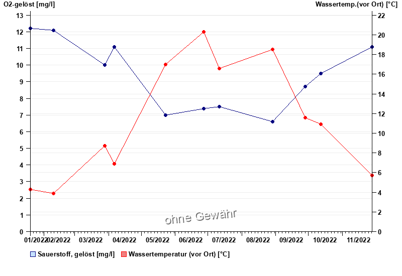 | Datum | O2-gelöst [mg/l] | Wassertemp.(vor Ort) [°C] |