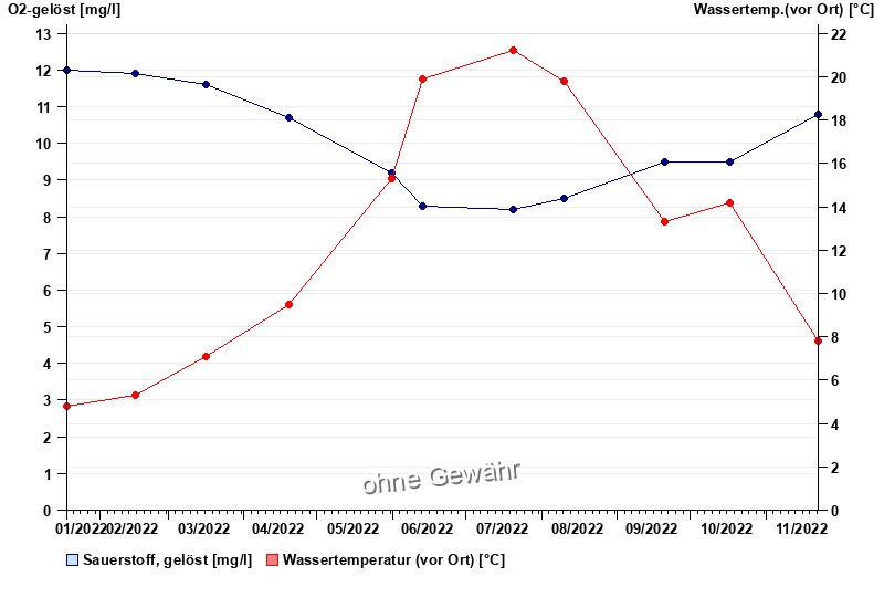 | Datum | O2-gelöst [mg/l] | Wassertemp.(vor Ort) [°C] |