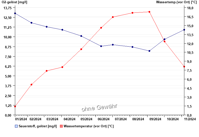 | Datum | O2-gelöst [mg/l] | Wassertemp.(vor Ort) [°C] |