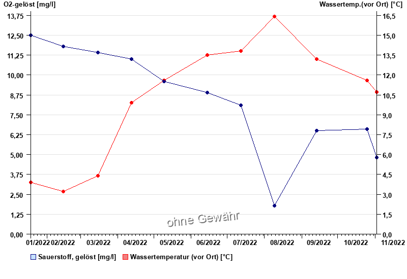 | Datum | O2-gelöst [mg/l] | Wassertemp.(vor Ort) [°C] |