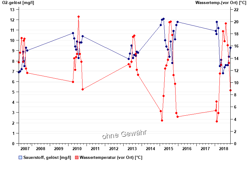| Datum | O2-gelöst [mg/l] | Wassertemp.(vor Ort) [°C] |