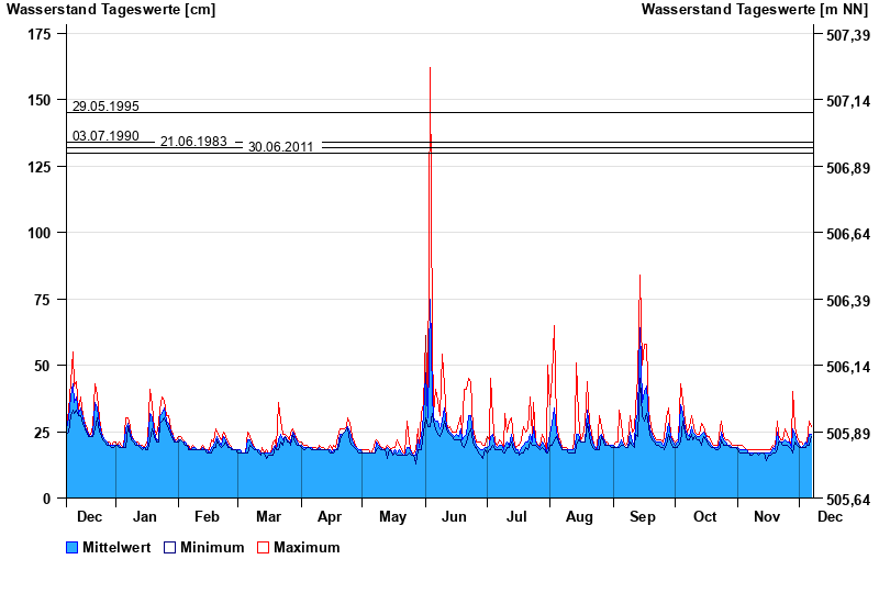 | Datum | Mittelwert [cm] | Maximum [cm] | Minimum [cm] |