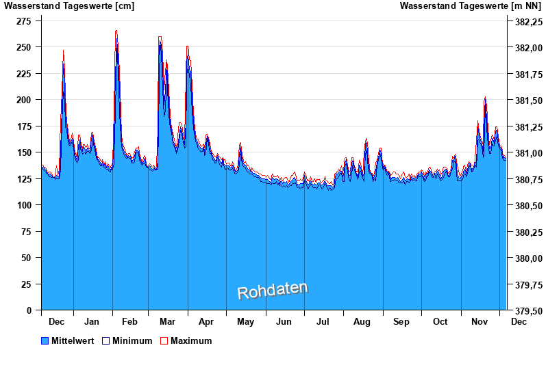 | Datum | Mittelwert [cm] | Maximum [cm] | Minimum [cm] |