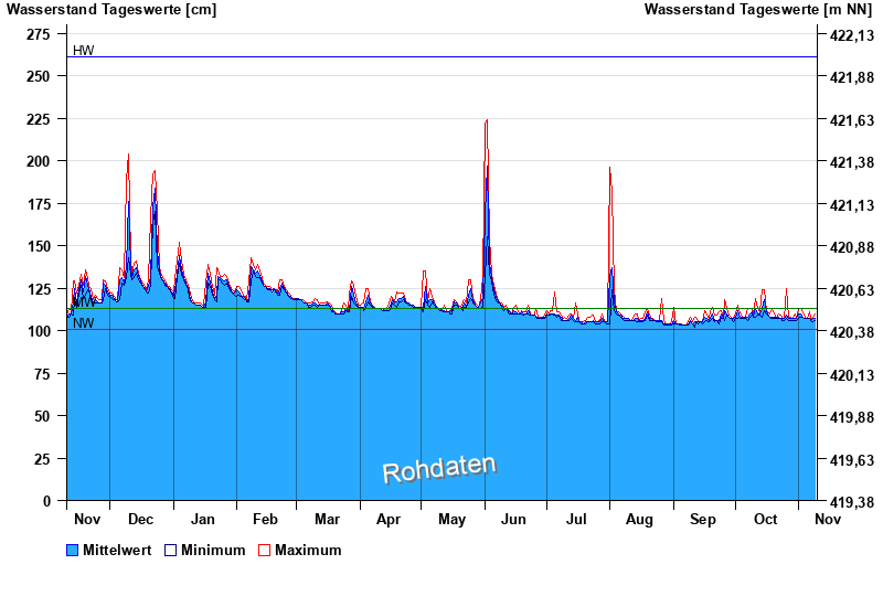 | Datum | Mittelwert [cm] | Maximum [cm] | Minimum [cm] |