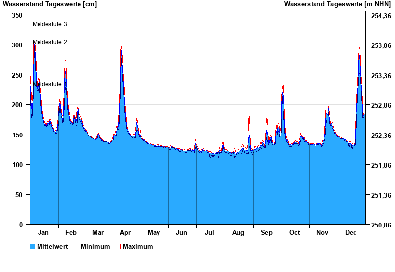 | Datum | Mittelwert [cm] | Maximum [cm] | Minimum [cm] |