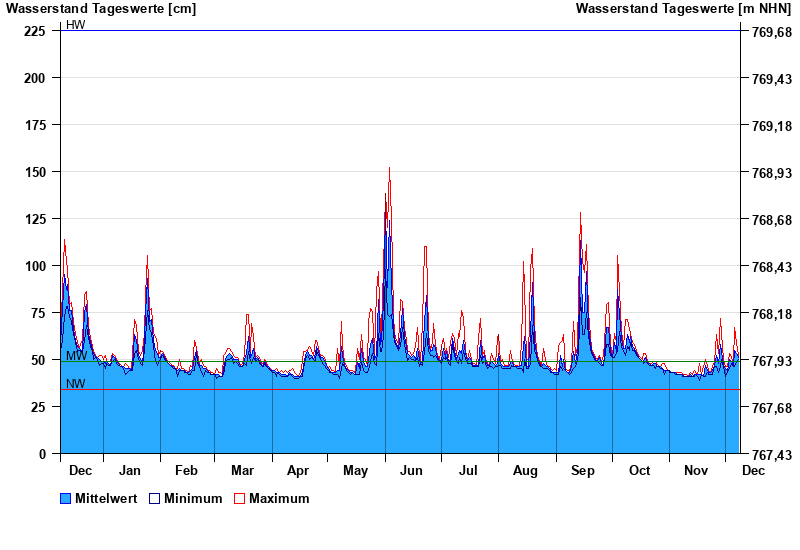 | Datum | Mittelwert [cm] | Maximum [cm] | Minimum [cm] |