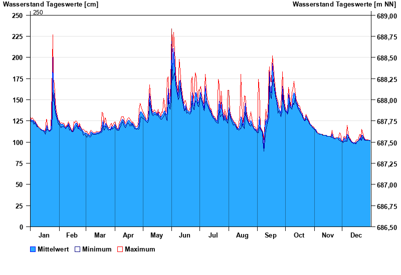 | Datum | Mittelwert [cm] | Maximum [cm] | Minimum [cm] |