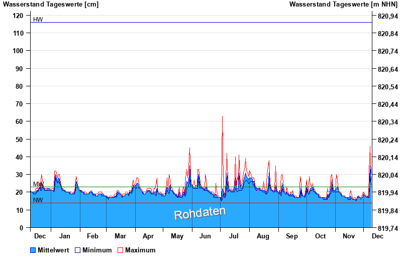 | Datum | Mittelwert [cm] | Maximum [cm] | Minimum [cm] |