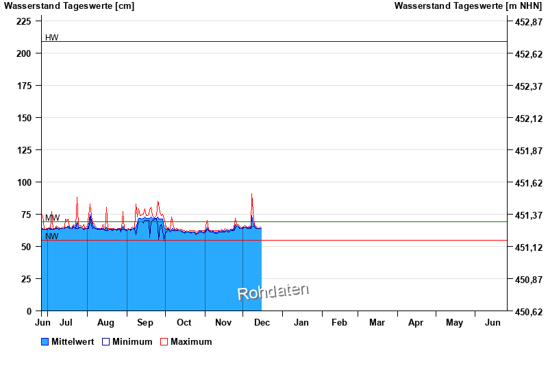 | Datum | Mittelwert [cm] | Maximum [cm] | Minimum [cm] |