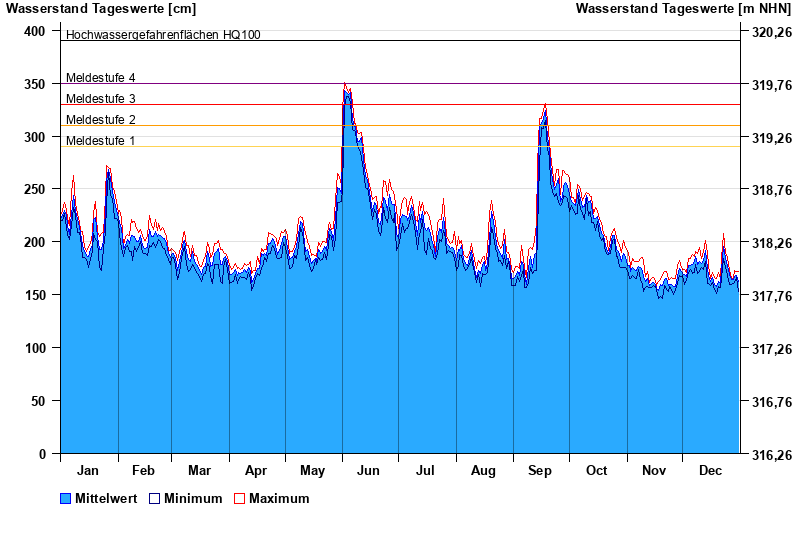 | Datum | Mittelwert [cm] | Maximum [cm] | Minimum [cm] |