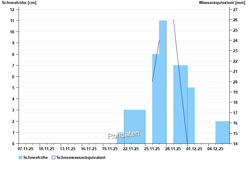 | Datum | Schneehöhe [cm] | Wasseräquivalent [mm] |