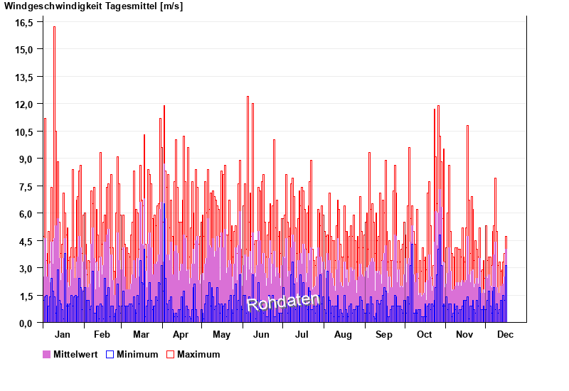 | Datum | Mittelwert [m/s] | Maximum [m/s] | Minimum [m/s] |