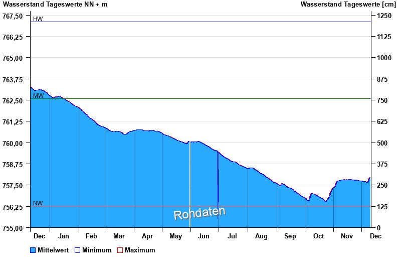 | Datum | Mittelwert [m ü. NN] | Maximum [m ü. NN] | Minimum [m ü. NN] |