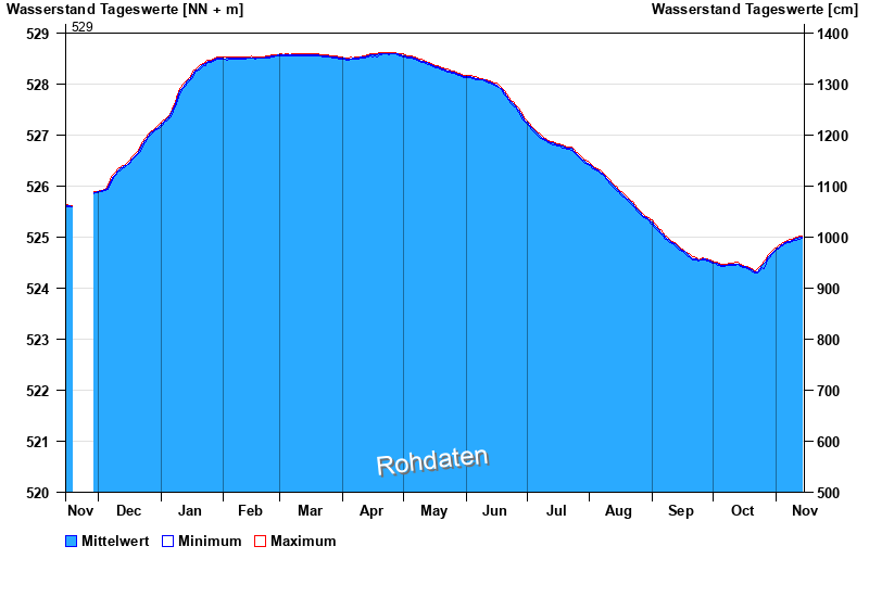 | Date | Mean value [m above sealevel] | Maximum [m above sealevel] | Minimum [m above sealevel] |