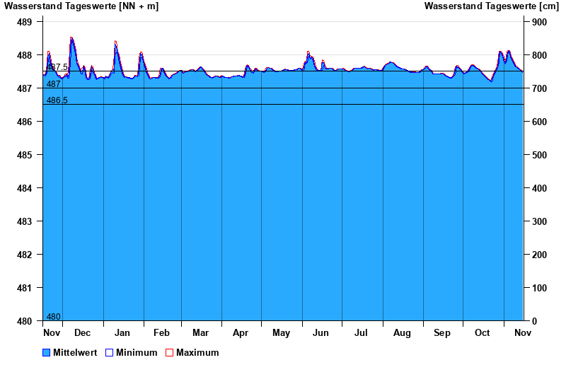 | Date | Mean value [m above sealevel] | Maximum [m above sealevel] | Minimum [m above sealevel] |