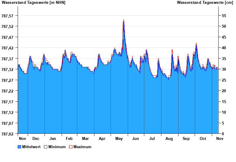 | Date | Mean value [m above sealevel] | Maximum [m above sealevel] | Minimum [m above sealevel] |