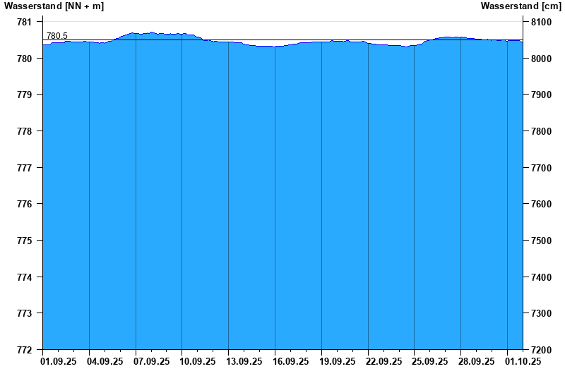 - 780,50 m ü. NN : Roßhaupten See: Normalstauziel Sommer (1. Juni - 15. Oktober)