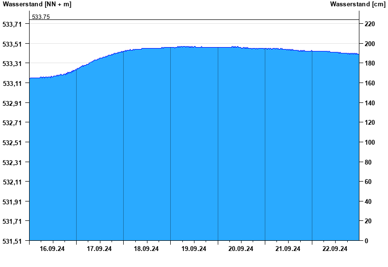 - 533,75 m ü. NN : Diessen: Uferpromenade Fussgängerunterführung der Eisenbahnbrücke ca. 20 cm im Wasser.