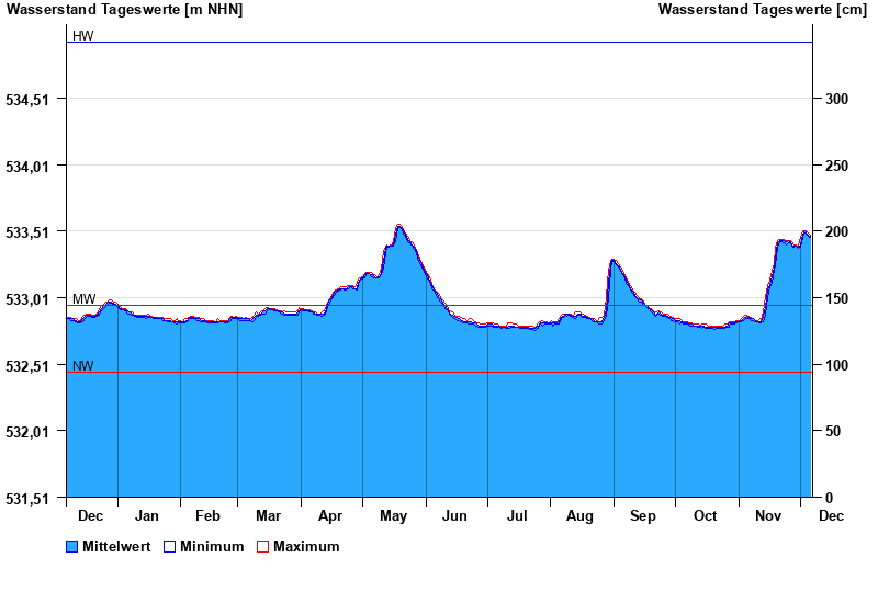 | Date | Mean value [m above sealevel] | Maximum [m above sealevel] | Minimum [m above sealevel] |
