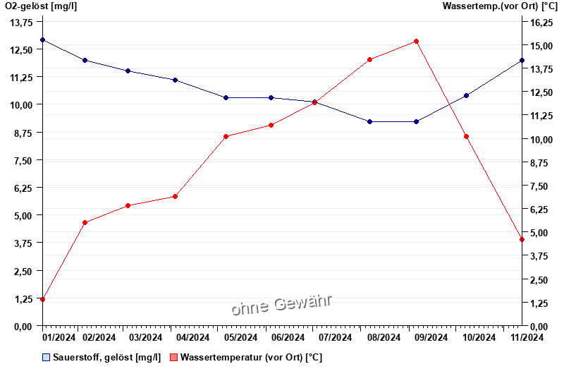 | Date | O2-gelöst [mg/l] | Wassertemp.(vor Ort) [°C] |