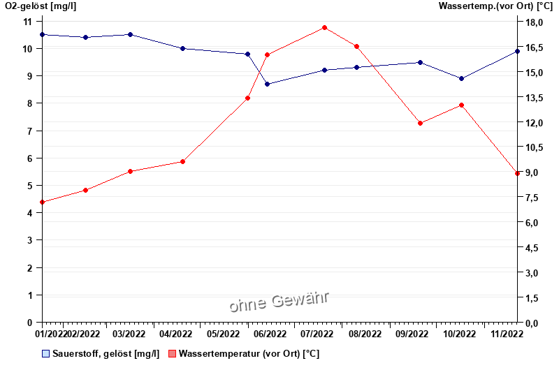 | Date | O2-gelöst [mg/l] | Wassertemp.(vor Ort) [°C] |