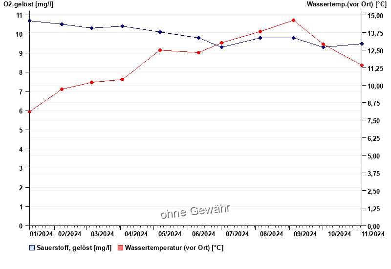| Date | O2-gelöst [mg/l] | Wassertemp.(vor Ort) [°C] |