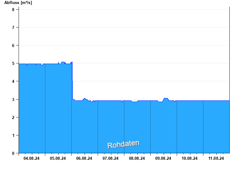 Der Pegel wird durch Baumaßnahmen unterhalb beeinflusst (Rückstau). Entsprechend sind die Abflusswerte nicht korrekt