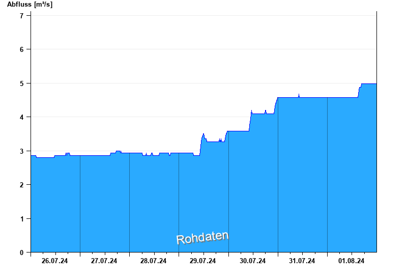 Der Pegel wird durch Baumaßnahmen unterhalb beeinflusst (Rückstau). Entsprechend sind die Abflusswerte nicht korrekt