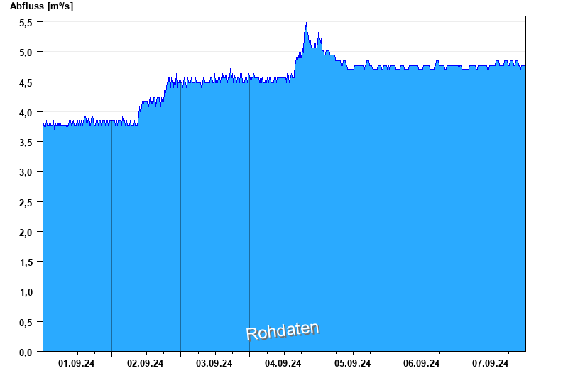 Der Pegel wird durch Baumaßnahmen unterhalb beeinflusst (Rückstau). Entsprechend sind die Abflusswerte nicht korrekt