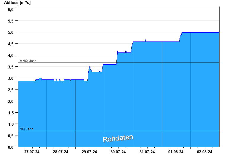 Der Pegel wird durch Baumaßnahmen unterhalb beeinflusst (Rückstau). Entsprechend sind die Abflusswerte nicht korrekt