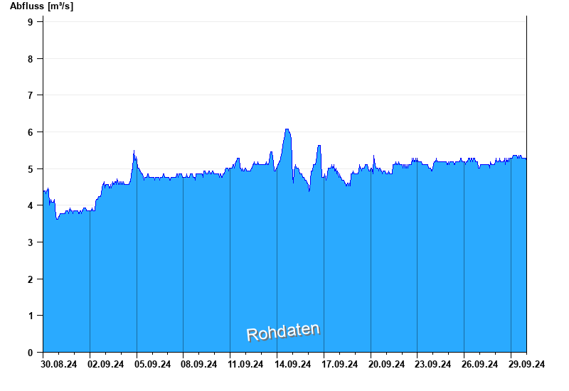 Der Pegel wird durch Baumaßnahmen unterhalb beeinflusst (Rückstau). Entsprechend sind die Abflusswerte nicht korrekt