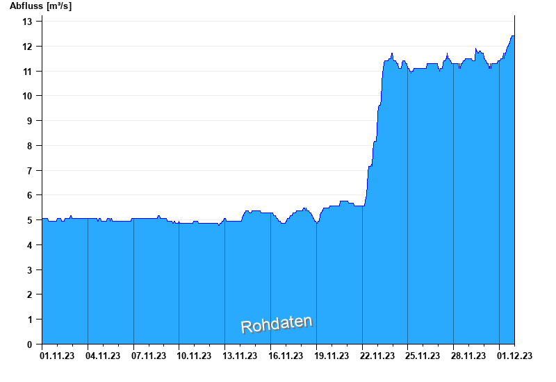 Der Pegel wird durch Baumaßnahmen unterhalb beeinflusst (Rückstau). Entsprechend sind die Abflusswerte nicht korrekt