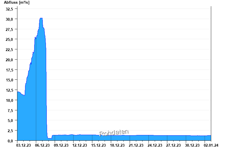 Der Pegel wird durch Baumaßnahmen unterhalb beeinflusst (Rückstau). Entsprechend sind die Abflusswerte nicht korrekt