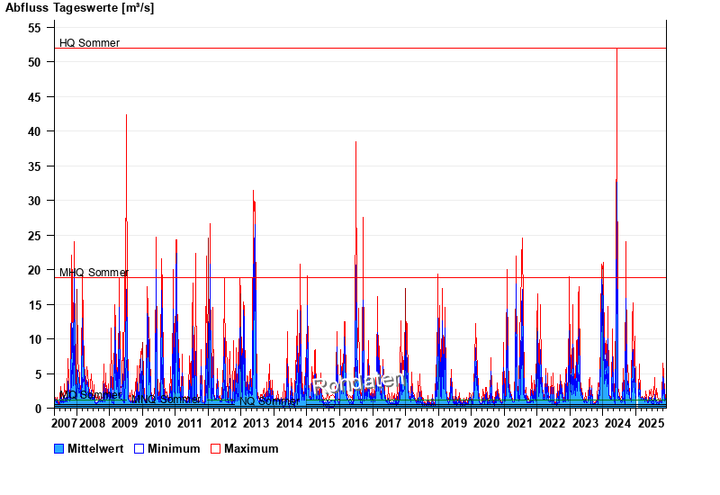 Discharge from 01.05.2007 to 06.12.2025| Date | Mean value [m³/s] | Maximum [m³/s] | Minimum [m³/s] |