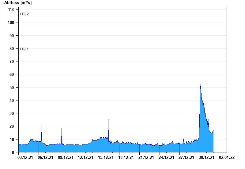 Messwerte beeinflusst durch Kraftwerkssteuerung und Kiesumlagerungen. Kiesanlandungen können bei Niedrigwasser Trockenlegung der Messinstrumente bewirken.