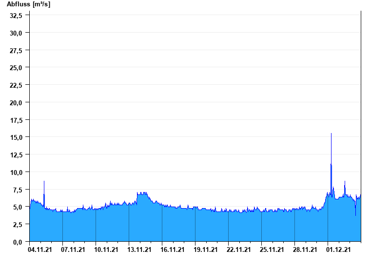 Messwerte beeinflusst durch Kraftwerkssteuerung und Kiesumlagerungen. Kiesanlandungen können bei Niedrigwasser Trockenlegung der Messinstrumente bewirken.