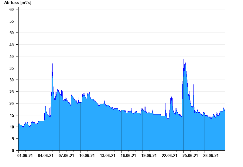 Messwerte beeinflusst durch Kraftwerkssteuerung und Kiesumlagerungen. Kiesanlandungen können bei Niedrigwasser Trockenlegung der Messinstrumente bewirken.