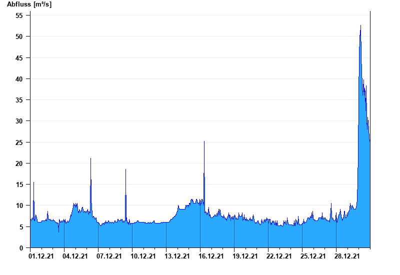 Messwerte beeinflusst durch Kraftwerkssteuerung und Kiesumlagerungen. Kiesanlandungen können bei Niedrigwasser Trockenlegung der Messinstrumente bewirken.