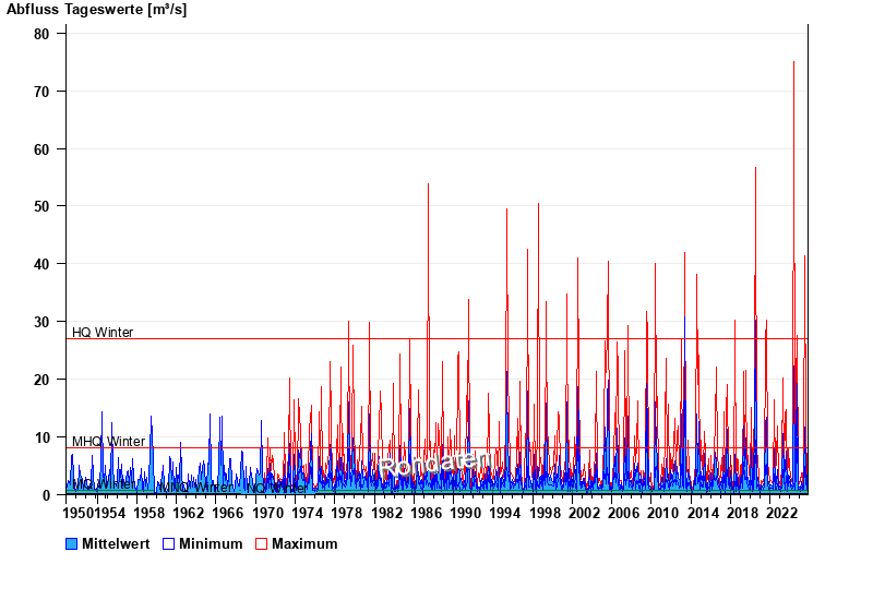Discharge from 01.11.1950 to 08.11.2025| Date | Mean value [m³/s] | Maximum [m³/s] | Minimum [m³/s] |