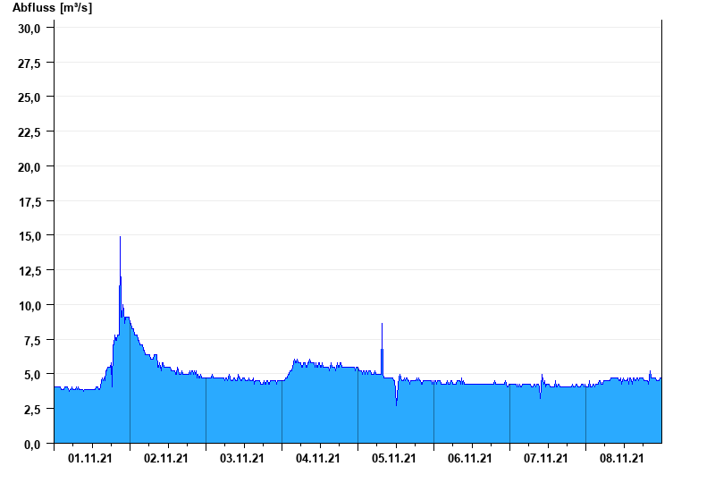 Messwerte beeinflusst durch Kraftwerkssteuerung und Kiesumlagerungen. Kiesanlandungen können bei Niedrigwasser Trockenlegung der Messinstrumente bewirken.