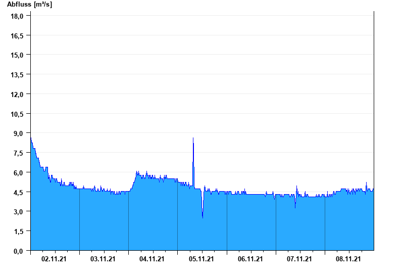 Messwerte beeinflusst durch Kraftwerkssteuerung und Kiesumlagerungen. Kiesanlandungen können bei Niedrigwasser Trockenlegung der Messinstrumente bewirken.